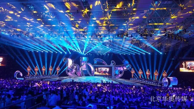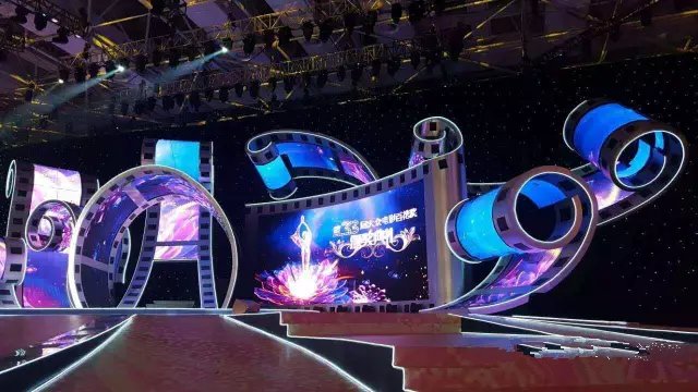 舞臺(tái)中央“膠片花”的輪廓采用鋁塑板,中間是曲面彩幕,整個(gè)舞臺(tái)的大背景是星光黑幕,寓意這是一個(gè)繁星璀璨的夜晚。