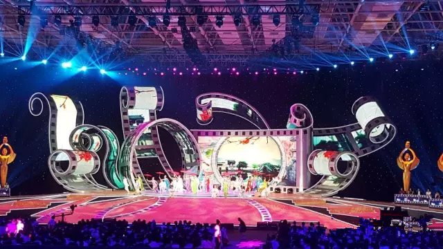 梁溪清先生將膠片、片夾等電影元素歸納、放大、典型化,把舞臺(tái)中央用膠片造型成花的具象;舞臺(tái)地面打破常規(guī),根據(jù)電影膠片的概念,量身定制,呈現(xiàn)異形、不規(guī)則、膠片的形狀。舞臺(tái)地面膠片就是一條電影之路,象征著中國電影的發(fā)展之路。本屆典禮的舞美視覺呈現(xiàn)被評(píng)為史上最具創(chuàng)意的晚會(huì)之一。