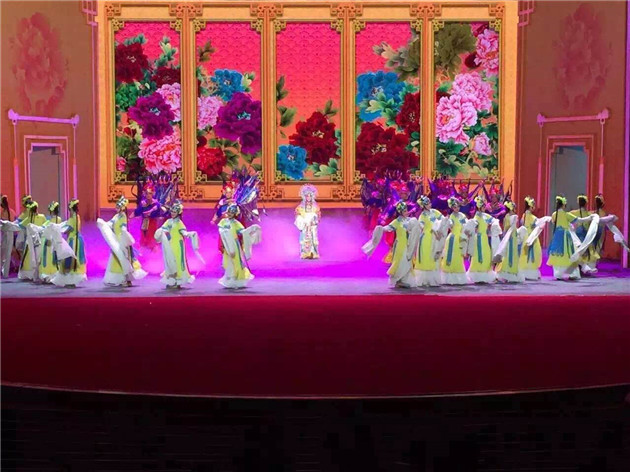 舞臺(tái)上,盛放的牡丹嬌艷奪目,象征不同劇種、不同流派競(jìng)相發(fā)展、相映生輝;金色的宮燈端莊大氣,寓意中華戲曲事業(yè)薪火相傳、發(fā)揚(yáng)光大。