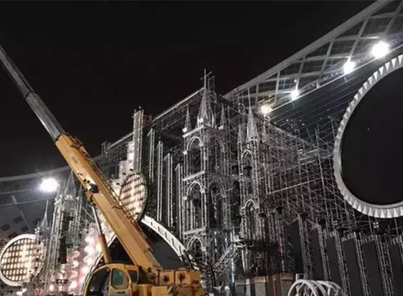 在去年高水準的基礎上,今年的舞美設計再次全面升級。不僅舞臺主景搭建了華麗的金屬鐘樓,現(xiàn)場還將布景、燈光與LED屏融為一體,打造出了“哥德式花園”,力求給觀眾帶來最震撼的視覺體驗。 視覺總設計 單天寶老師此次摒棄了以往耗資巨大的景物制作,通過現(xiàn)有材料的重新組合和構架,搭建出了氣勢磅礴的古堡。